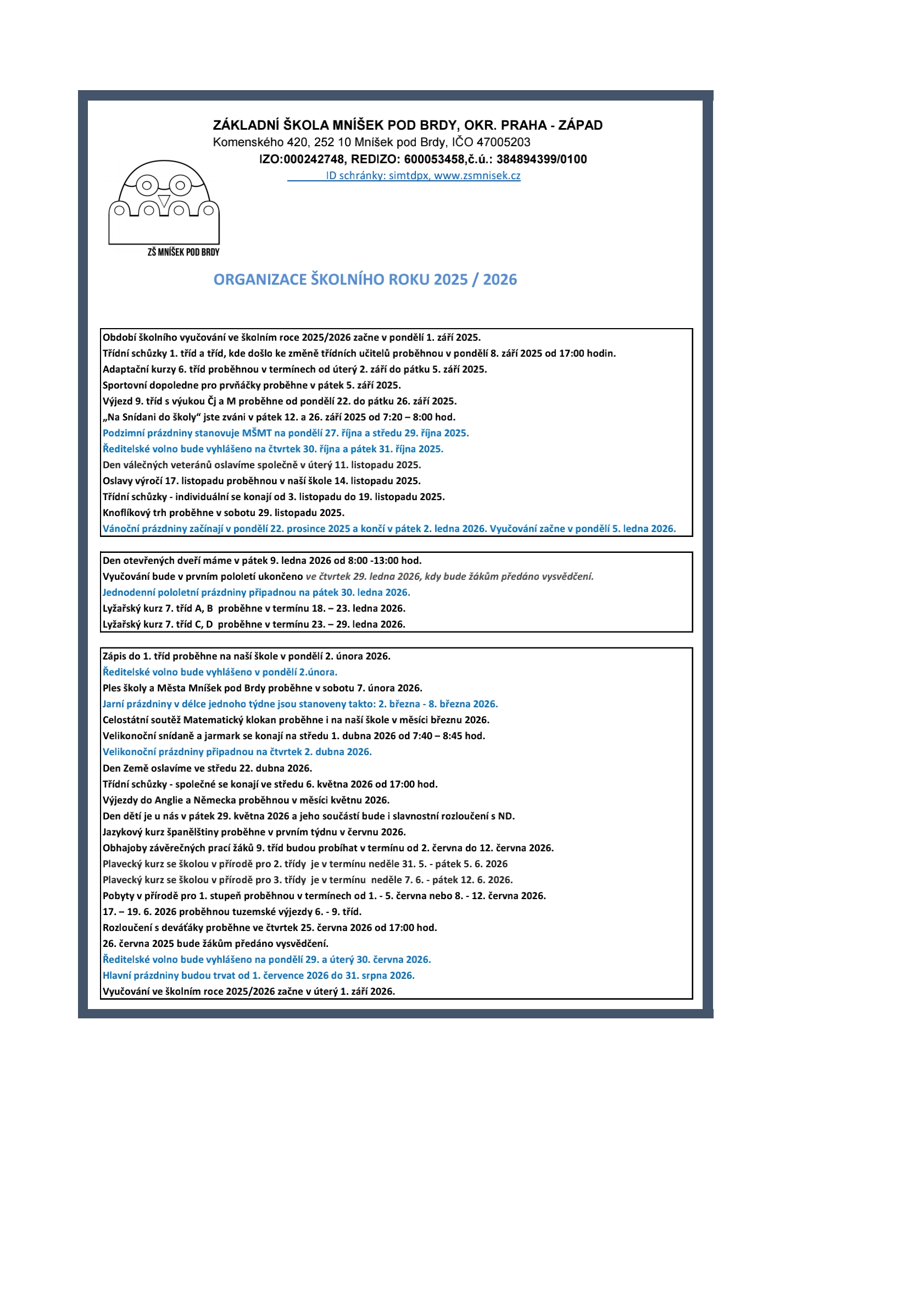 ORGANIZACE ŠKOLNÍHO ROKU 2024 / 2025 ke stažení ve formátu PDF